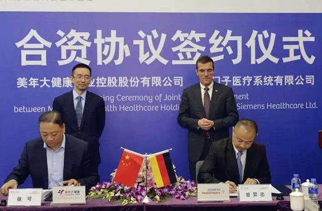 Meinian Onehealth Holding GmbH(Abkürzung “Meinian Onehealth” oder “Meinian”) und Siemens Healthcare GmbH(Abkürzung “Siemens Healthcare China”) haben angekündigt, dass sie ein Abkommen treffen haben und eine selbst?ndige medizinische Bilddiagnose-Zentrum gründen werden. Der Vorstandsvorsitzender(Meinian Onehealth) Yu Rong, Pr?sident Xu Ke, COO(Siemens Healthcare) Michael Reitermann und Pr?sident(Siemens Healthcare China) Zeng Fanzhong sind pr?sent.