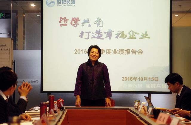 Von 15. Oktober bis 16. Oktober 2016 fand Konferenz des Leitungsbereichtes des dritten Vierteljahres von der Gruppe Century Galaxy in Peking statt. Vorstandsvorsitzenderin Guo Meiling, Generaldirektor Zhao Qi, Vizepr?sident Zheng Baomei von der Gruppe Century Galaxy hatten an der Konferenz teigenommen. Die Firma von Weifang Century Galaxy, Firma Shanhai Kanglin Renhe, traditionelles Projekt, Deutsche Firma Bicom, Firma Bicom(China), Jingke-Projekt in Tibet, Jiamin Medizin, Rayonex Projekt von Deutschland, ?Huatai Konno, Firma Shiboda und Huien Weiye Technik GmhH haben an der Sitzung teilgenommen, der Generaldirektor Zhao Qi hatte die Konferenz geleitet.?