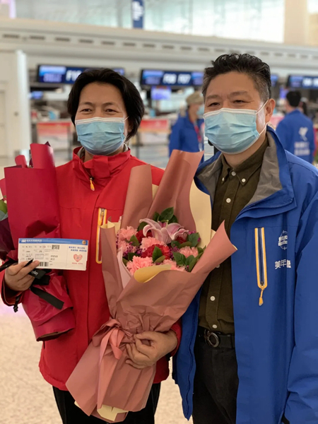 俞熔董事長(zhǎng)迎接抗疫英雄的隊(duì)伍,并向國(guó)家衛(wèi)健委、民航總局、武漢市人民政府、上海市衛(wèi)健委、上海市閔行區(qū)政府、以及虹橋機(jī)場(chǎng)、東方航空、錦江集團(tuán)等企事業(yè)單位致以最誠(chéng)摯的感謝。