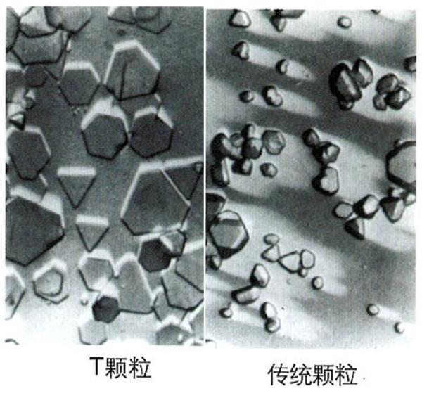 T顆粒膠片的乳劑中還添加了一種品紅染料以吸收可能產生熒光交送效應的熒光. 大約可以降低50%的熒光交迭效應, 從而大大提高了影像的清晰度。