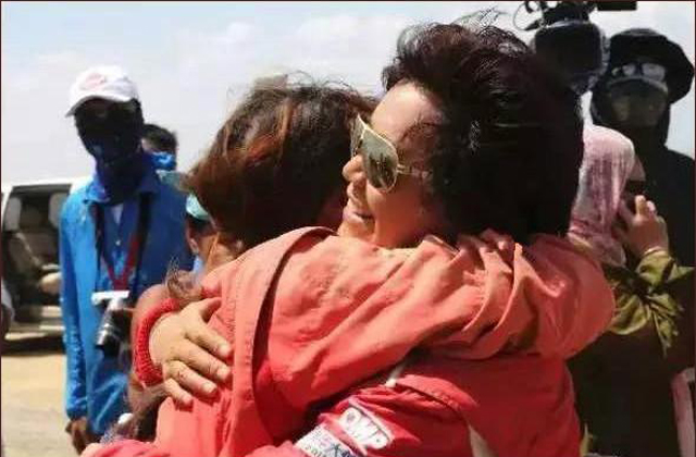 Navigator Zhou Guifen of "Xinjiang Beixin Road & Bridge Pull motorcade" held Guo Meiling in arms, the Racing Driver from "Meinian Onehealth·Brave Team".
